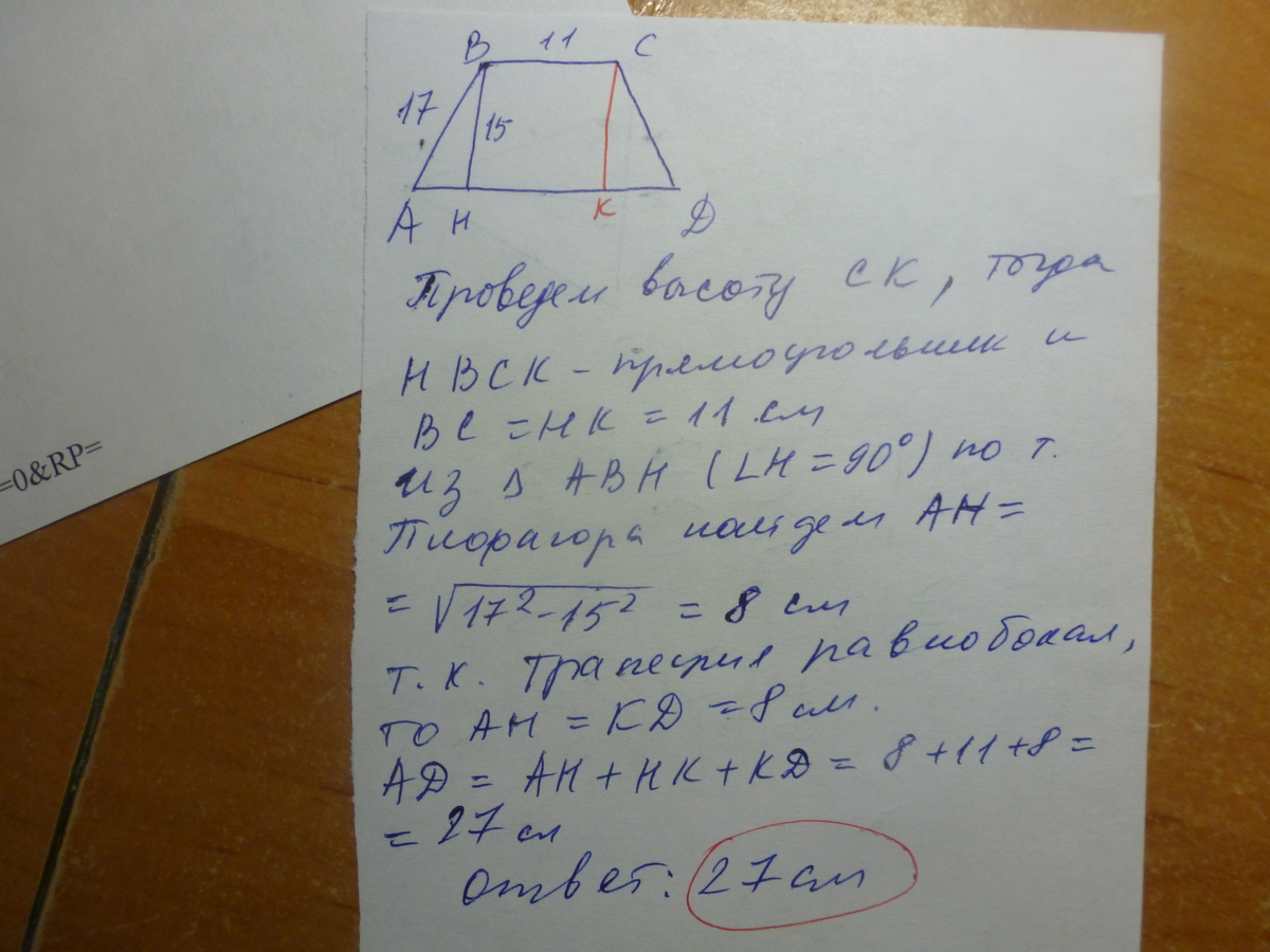 Боковая сторона равнобокой трапеции равна 17 см, меньшее основание 11см, высота 15 см. Найти большее основание.