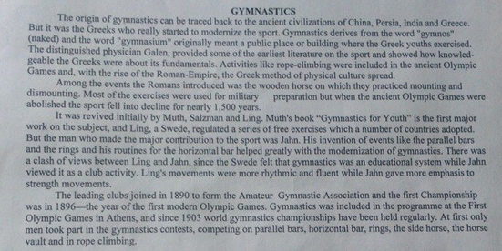 Происхождение гимнастика ведет свою истории от древних цивилизаций Китай Персия Индия и Греция. Но это был грек,который начал модернизировать спорт. Гимнастика происходит от слова голый и слова спортзал означает публичное место или здание где занимались молодые греки. Заслуженный врач Гален обеспечивал некоторые из ранней литературы о спорте и показывал как хорошо знающий греки были около из основы. Занятие подобно лазанью по канату были включены в древние олимпийские игры и c подъемом римской империи распространился греческий метод физкультуры.