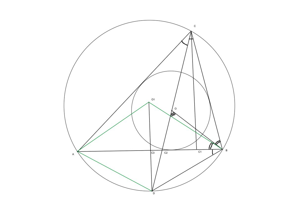 1) Дуги DB и DA равны, поскольку СВ - биссектриса. => равны центральные углы AO1D и AO1D. => O1D биссектриса в равнобедренном треугольнике, то есть она перпендикулярна основанию AB и делит его пополам. Ну это равносильно тому, что она проходит через середину AB - точку C3, и параллельна высоте CC1.