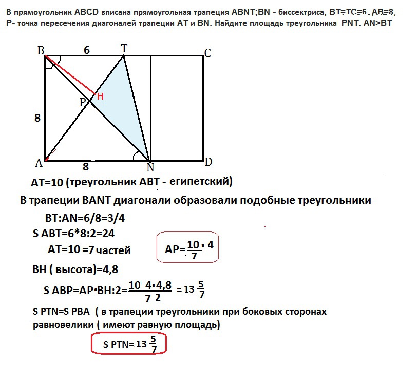 В прямоугольник abcd вписана прямоугольная трапеция abnt, bn биссектриса, bt=tc=6, ab=8, p точка пересечения диагоналей трапеции at и bn, найдите площадь треугольника pnt, an>bt(чтобы у вас чертеж правильней получился). Пожалуйста объясните поподробней!