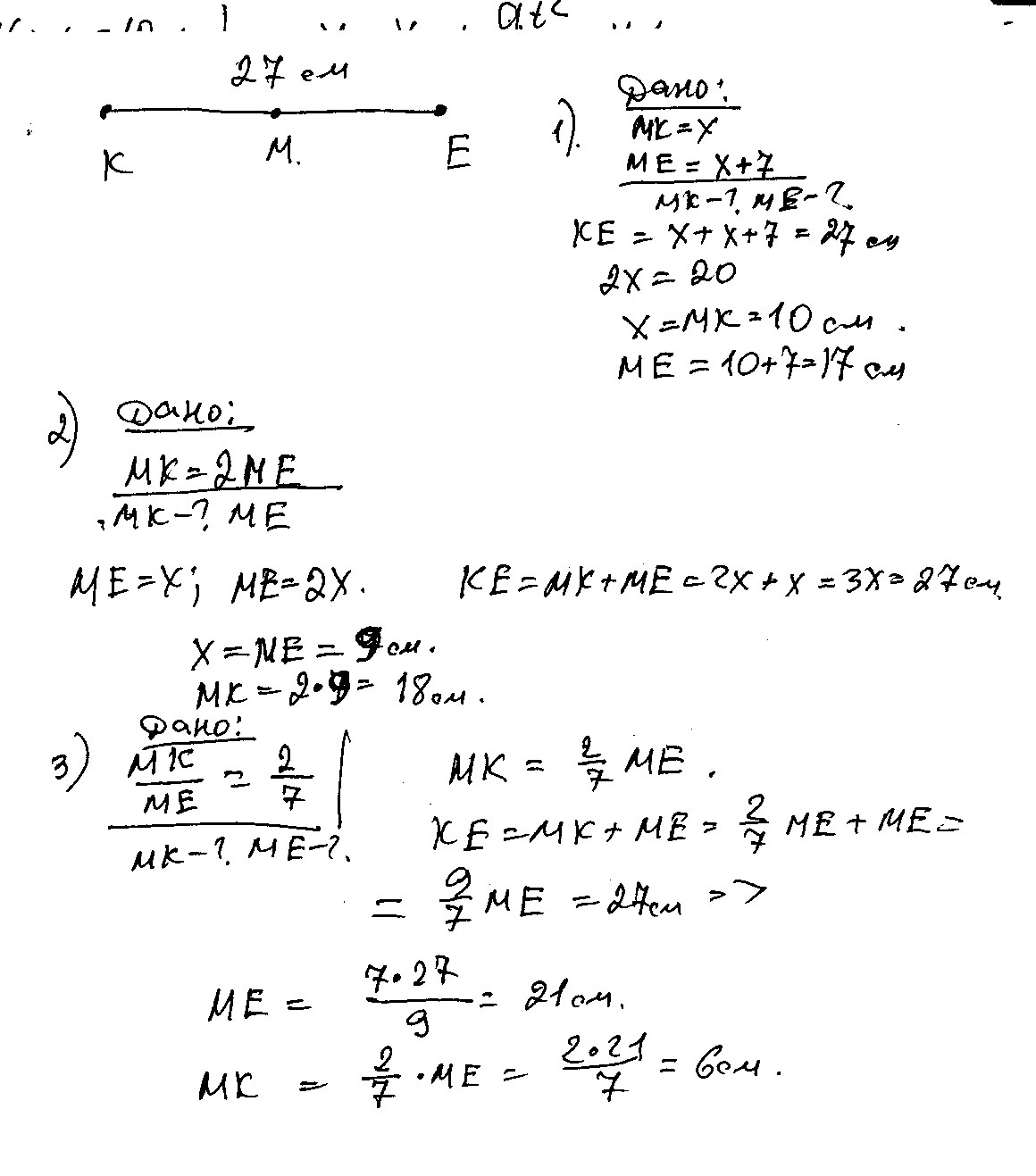 точка М принадлежит отрезку KE, длина которого равна 27 см. найдите длины отрезков MK и ME, если: 1) длина отрезка МК на 7 см меньше длины отрезка МЕ; 2) длина отрезка МК в 2 раза больше длины отрезка МЕ; 3) МК : МЕ= 2:7. ПРОШУ ВАС ОЧЕНЬ ОЧЕНЬ НАДО!!!! ДАЮ 20 БАЛЛОВ