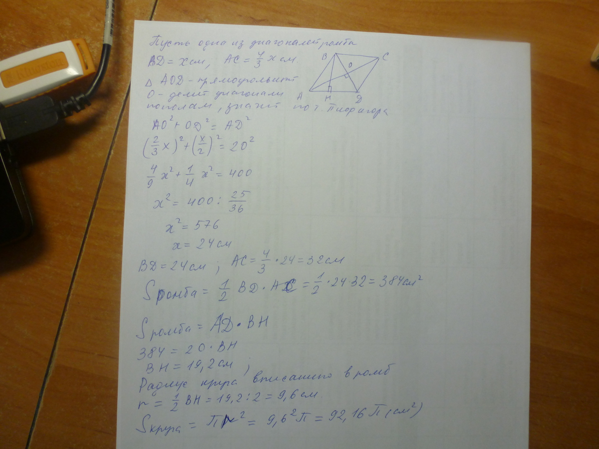 В ромб, сторона которого 20 см, вписан круг. Найти площадь круга, если одна диагональ ромба больше другой в 4/3 раза.