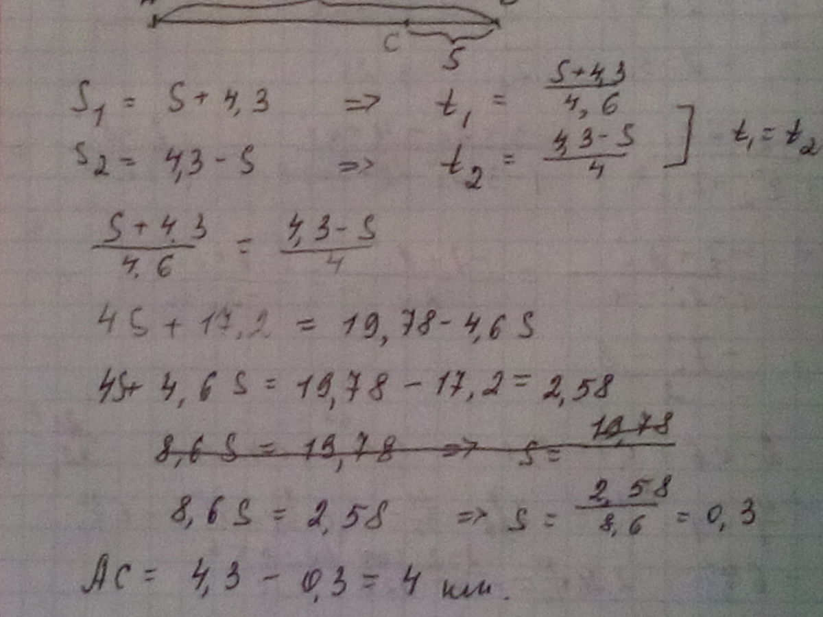 Два человека отправляются из одного и того же места на прогулку до опушки леса , находящейся в 4, 3 км от места отправления . Один идет со скоростью 4 км/ч , а другой со скоростью 4, 6 км/ч . Дойдя до опушки леса , второй с той же скоростью возвращается обратно . На каком расстоянии от точки отправления произойдет их встреча :? Дайте ответ в километрах .