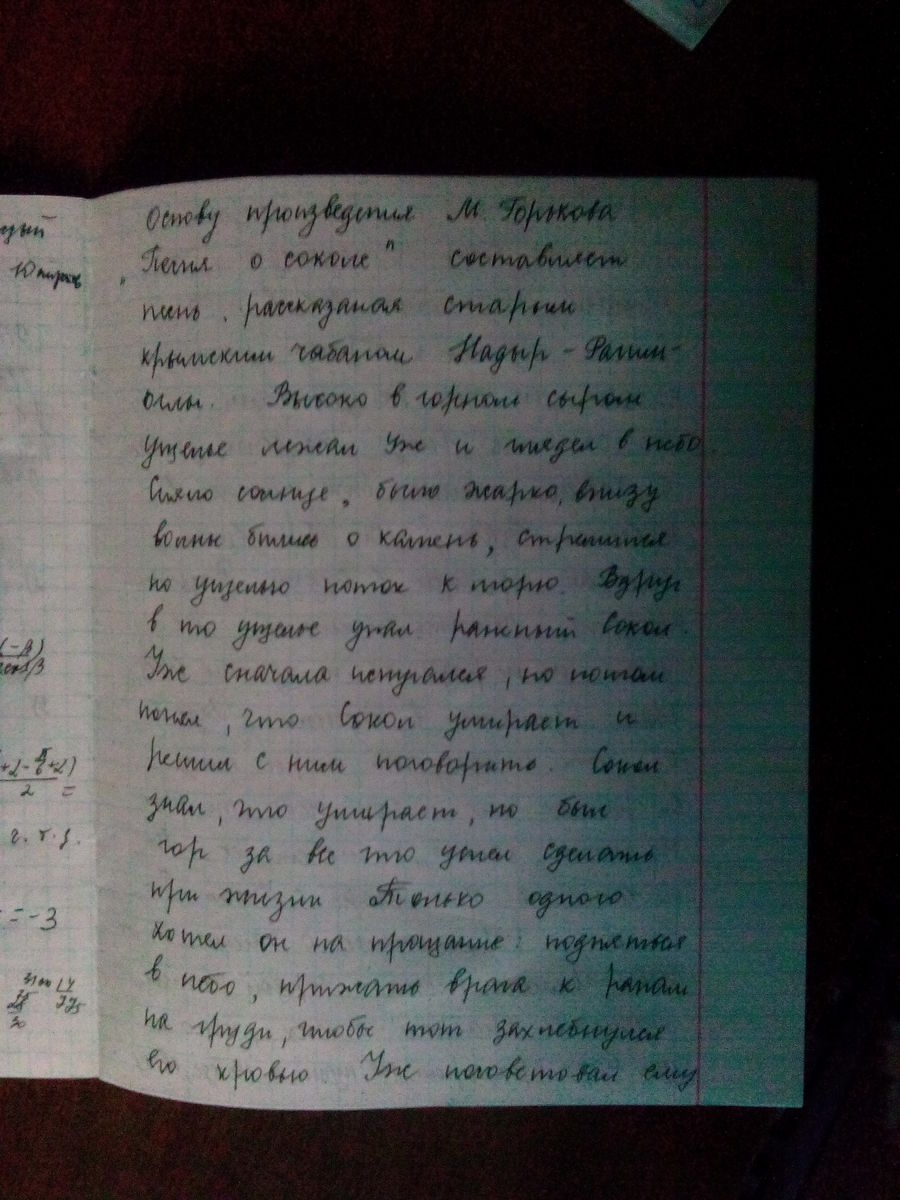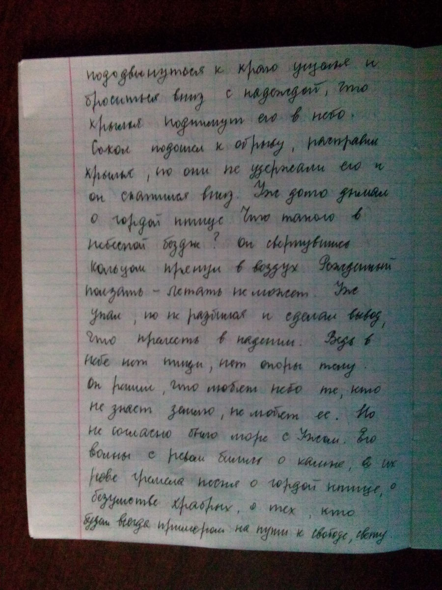 Сокол падает на землю после кровавой битвы и , заметив его уж подходит к нему . Он спрашивает его не уж то он умирает и Сокол гордо говорит , что сражение там было таким приятным , сама сладость и простонал что вот бы , в последний раз взлететь на небо , туда , высоко к солнцу , и прижать бы врага к кровавому груди , чтобы тот от крови задохнулся... Змей не долго думая предлагает соколу бросится с обрыва , быть может крылья его расправятся и он вновь взлетит , но сокол сбросившись с обрыва, камнем упал в бездну , его жизненный полёт кончился ... Змей посмотрев вниз, подумал , что может там на небе и впрямь так сладко , что сокол там бился , и свернувшись кольцом подпрыгнул к солнцу , но упал о камень , но не разбился ..И вот его рассуждения , после этого всего
