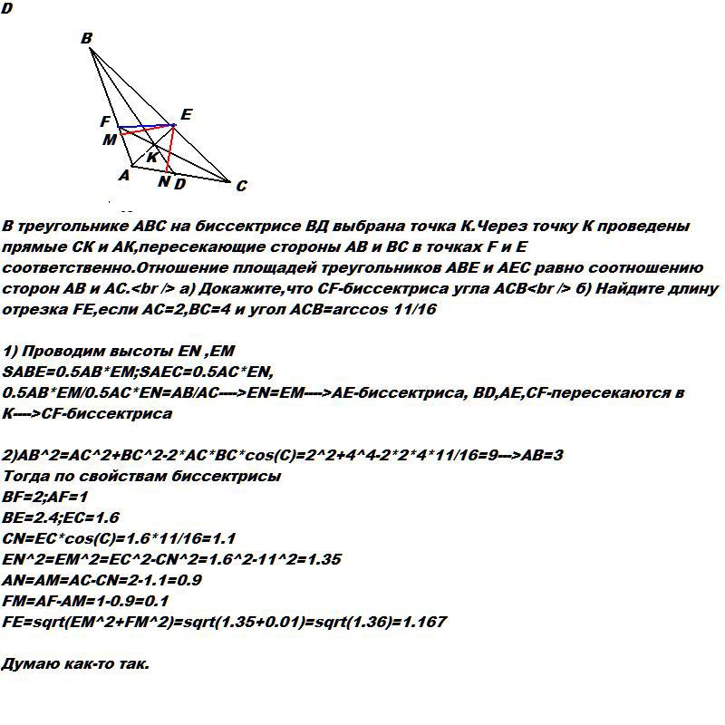 б) Найдите длину отрезка FE,если AC=2,BC=4 и угол ACB=arccos 11/16