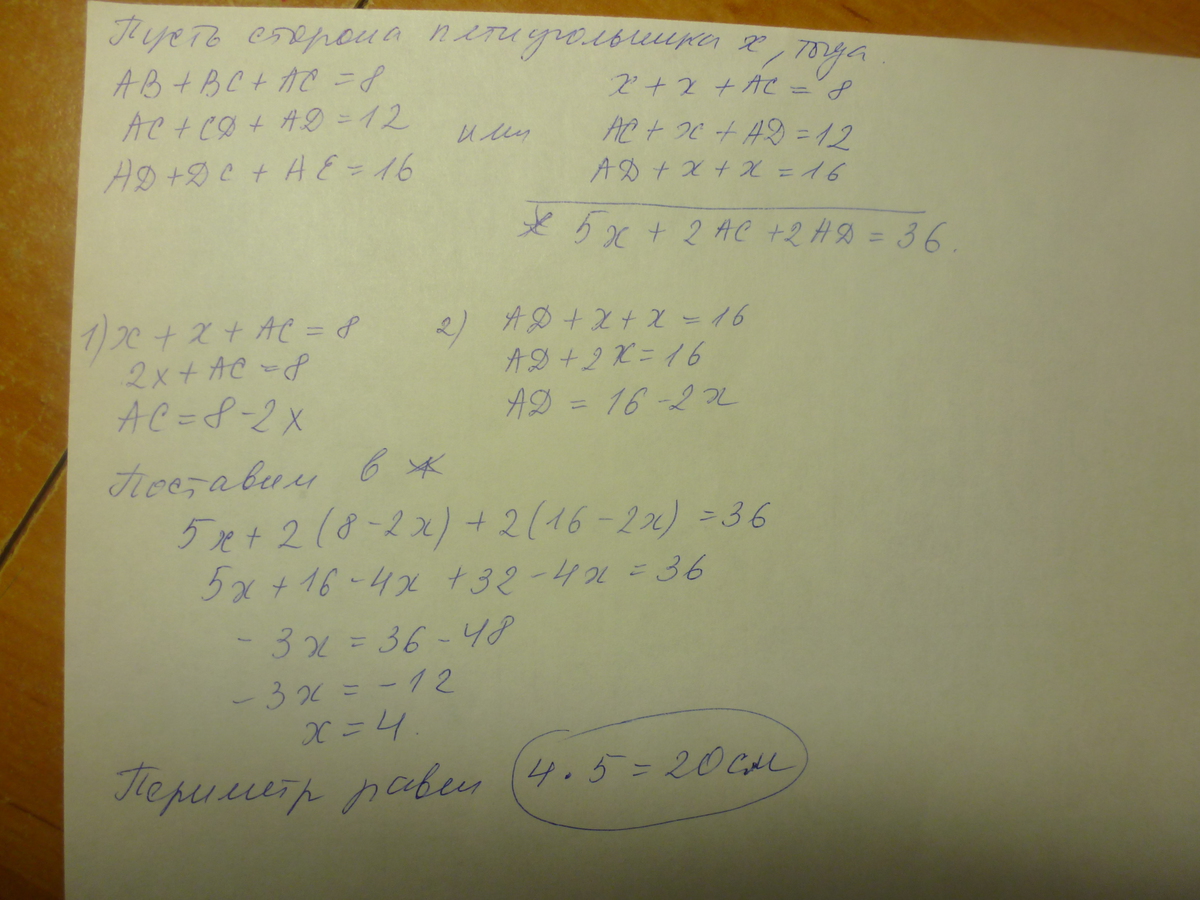 У пятиугольника abcde все стороны равны.известно,что периметр треугольника abc равен 8,периметр треугольника acd - 12 см, а периметр треугольника ade - 16 см.Найдите периметр пятиугольника.