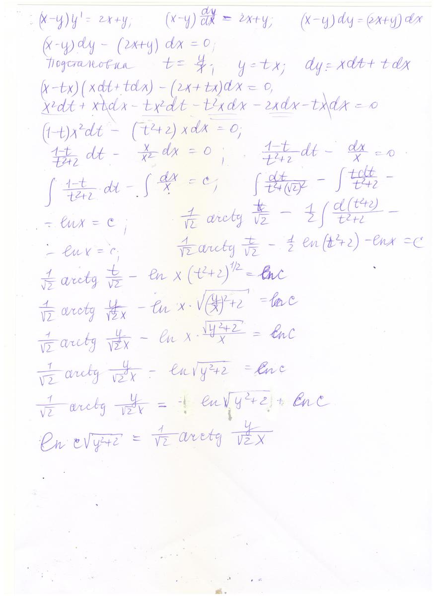 помогите пожалуйста найти общее решение(общий интеграл) дифференциального уравнения первого порядка (x-y)y'=2*x+y