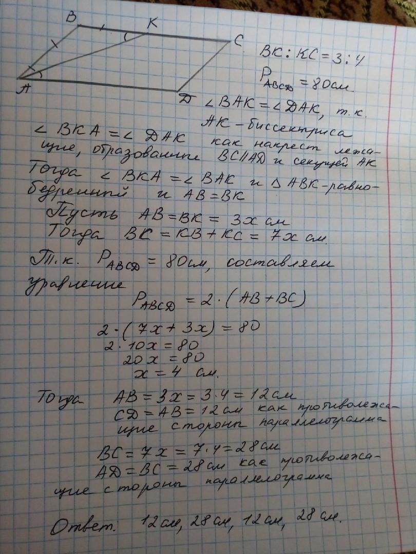 Бісектриса гострого кута паралелограма ділить протилежну сторону у відношенні 3:4, рахуючи від вершини тупого кута. Периметр паралелограма дорівнює 80см. Знайдіть його сторони.