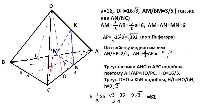 правильная треугольная пирамида рассечена плоскостью перпендикулярной основанию и делящей две стороны основания в отношении 3:5 считая от вершины основания. Найти объём отсеченой пирамиды если сторона основания пирамиды равна 16 а высота пирамиды 16 корень из 3