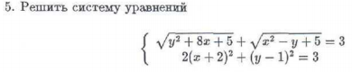 { √(y^2 + 8x + 5) + √(x^2 - y + 5) = 3