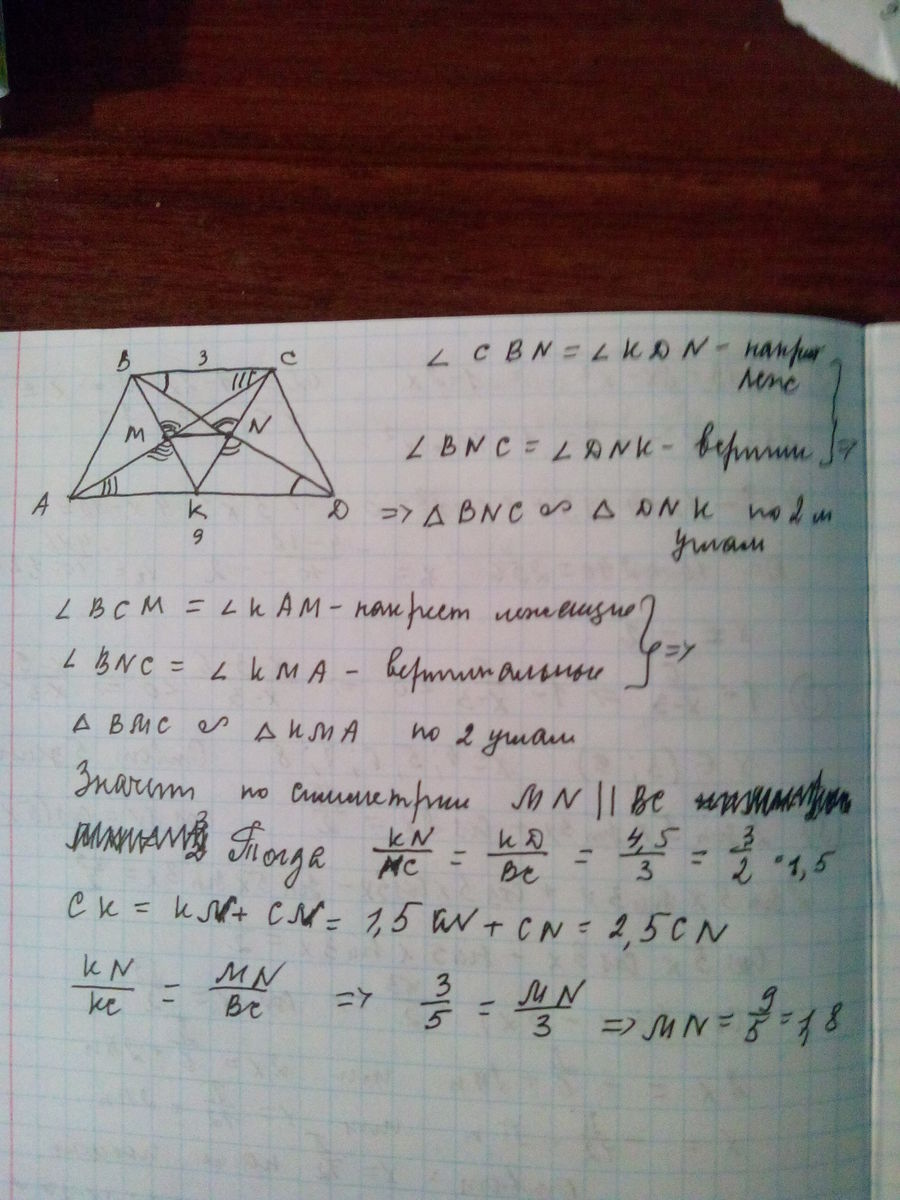Основания равнобочной трапеции равны 3 и 9. Прямые, соединяющие середину большего основания с концами меньшего основания, пересекают диагонали трапеции в точках M и N. Найдите длину отрезка MN.
