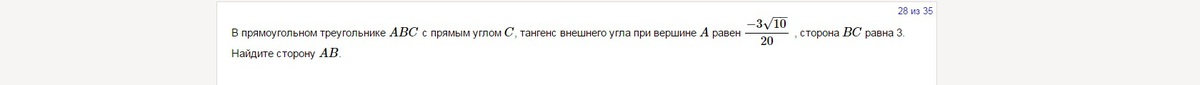 Пусть ВНЕШНИЙ угол равен α, значит угол А треугольника равен (180-α). Уточняем, что tg(180-α)= -tgα. Значит тангенс угла А = 3√10/20.