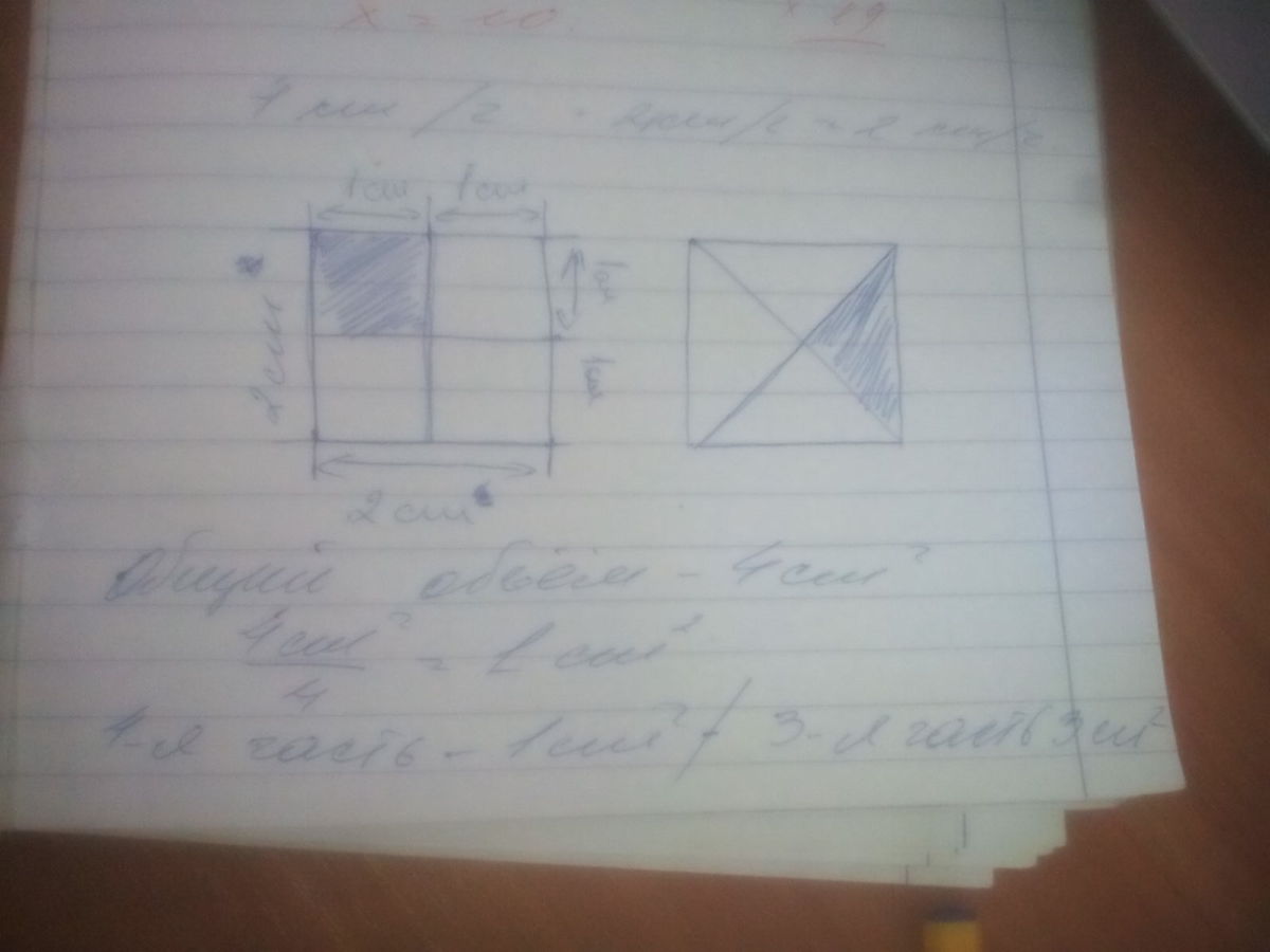Начерти квадрат, площадь которого равна 4 см2. Раскрась его четвёртую часть. Покажи как это можно сделать по разному . Сколько квадратных сантиметров раскрашено? Чему равна площадь нераскрашенной части?