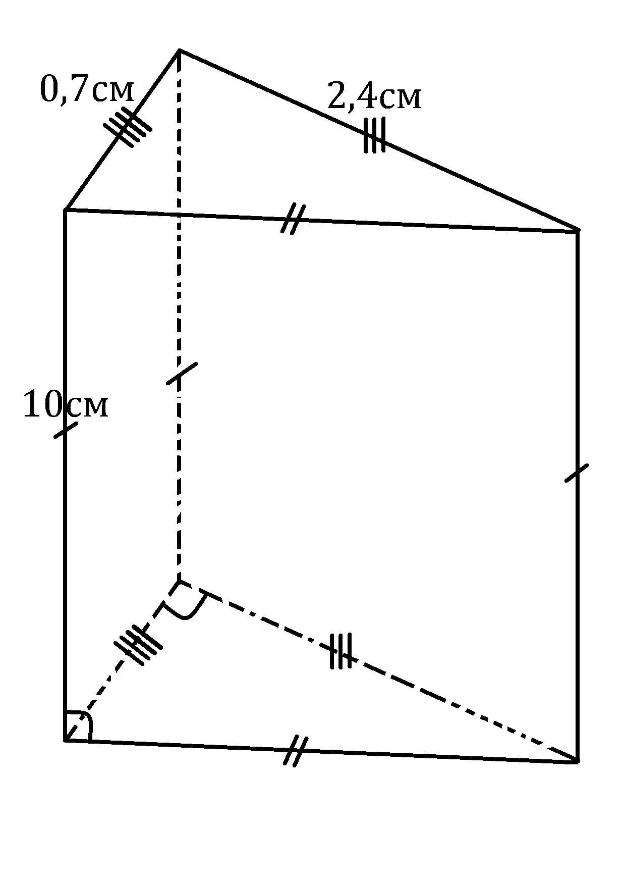 Основание прямой треугольной призмы является прямоугольный треугольник с катетами 0.7 см и 2.4 см , боковое ребро призмы ровно 10 см. Найдите площади боковой и полной поверхности призмы.