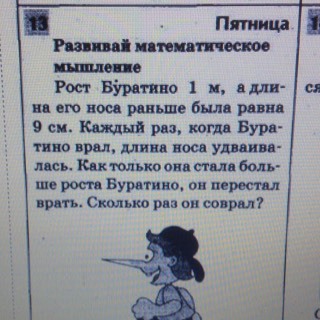 Рост Буратино 1 м, а длина его носа раньше была равна 9 см. Каждый раз, когда Буратино врал, длина носа удваивалась. Как только она стала больше роста Буратино, он перестал врать. сколько раз он соврал?
