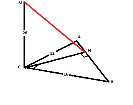 Помогите пЖ...Катеты прямоугольного треугольника АВС равны 12 и 16 дм. Из вершины прямого угла С к плоскости треугольника восстановлен перпендикуляр СМ равный 28 дм Найдите расстояние от точки М до гипотенузы.Если можно и рисунок.