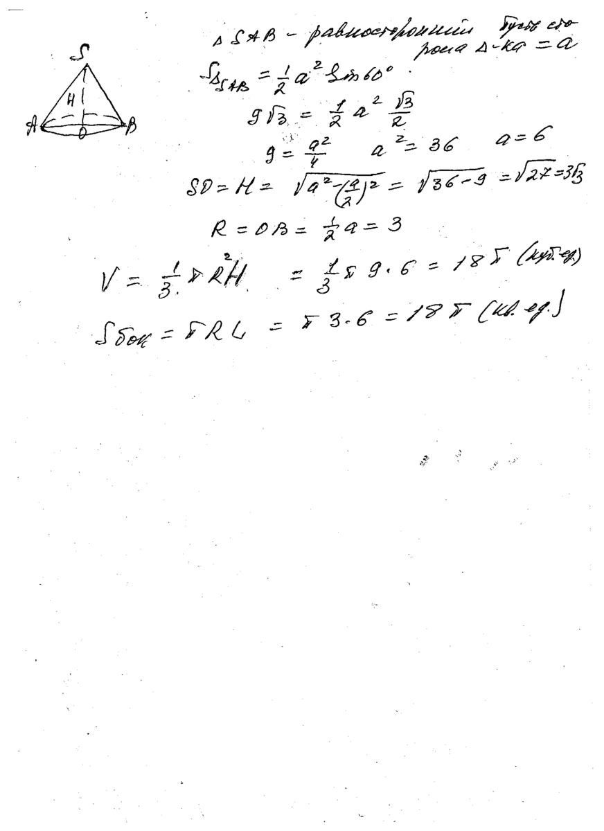 Найти объем и площадь боковой поверхности равностороннего конуса если площадь его осевого сечения =9 корней из 3 см2