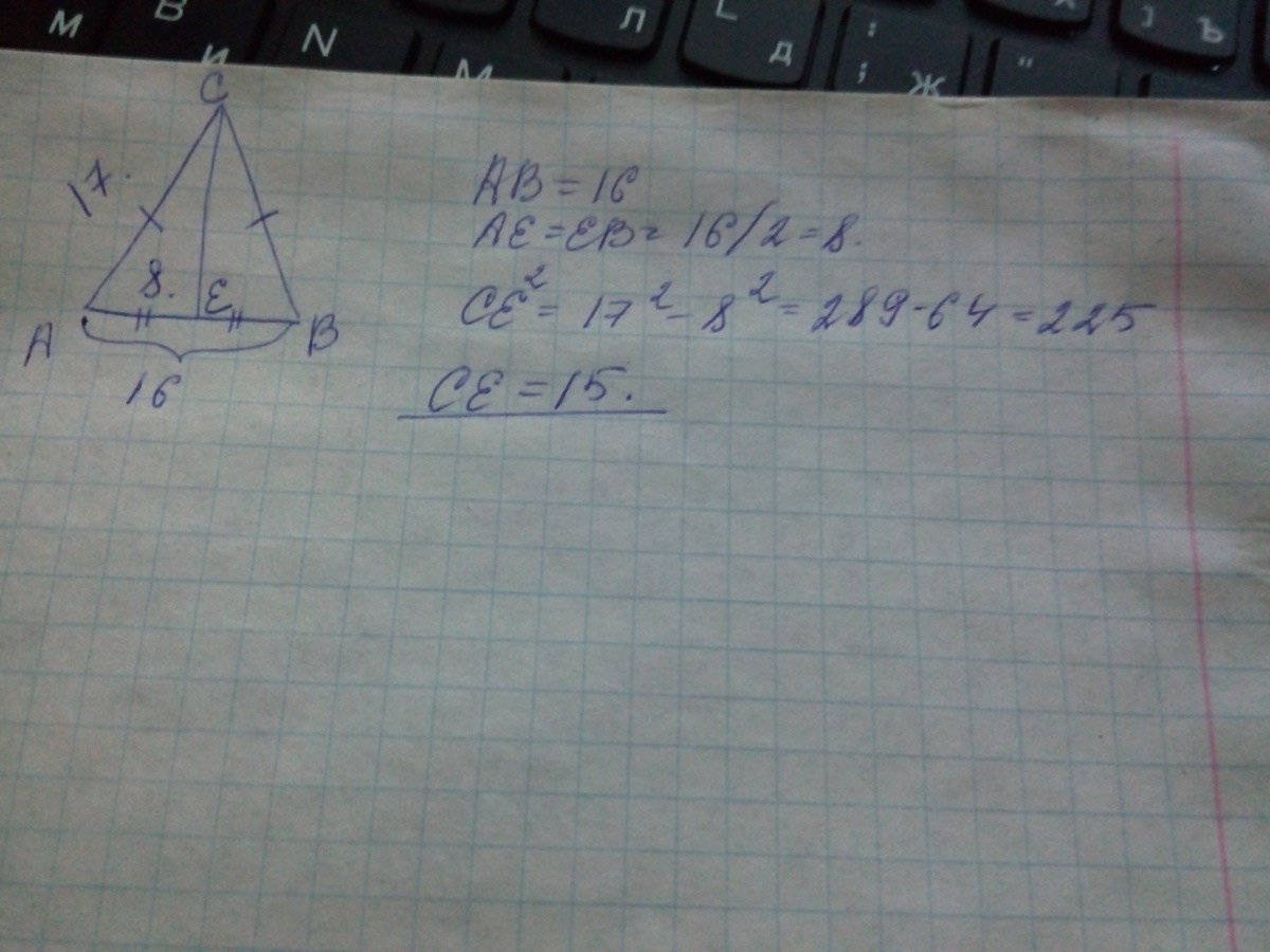 в равнобедренном треугольнике боковая сторона 17 см ,а основание 16 см,найти высоту опущенную на основпние