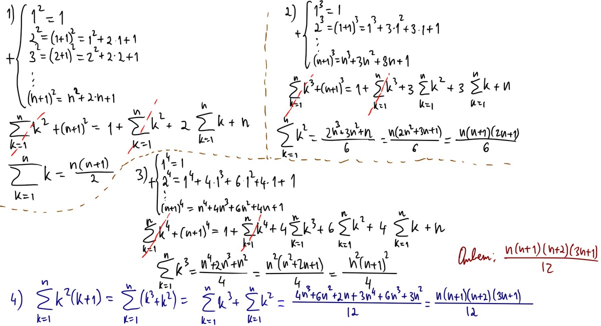 Решение на картинке - в пункте 1 вывод формулы суммы от 1 до n, в пункте 2 - формулы суммы квадратов от 1 до n, в пункте 3 - формулы суммы кубов от 1 до n, в пункте 4 решение исходной задачи.
