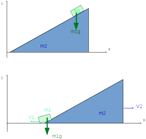 Систему координат определим таким образом: Ось Y напрравим вертикально вверх, ось X направим горизонтально вдоль поверхности, на которой лежит призма.Что-то мне подсказывает, что поскольку в горизонтальной плоскости на систему призма-тело внешние силы не действуют (трением пренебрегаем), то должен выполняться закон сохранения импульсов (на оси X)