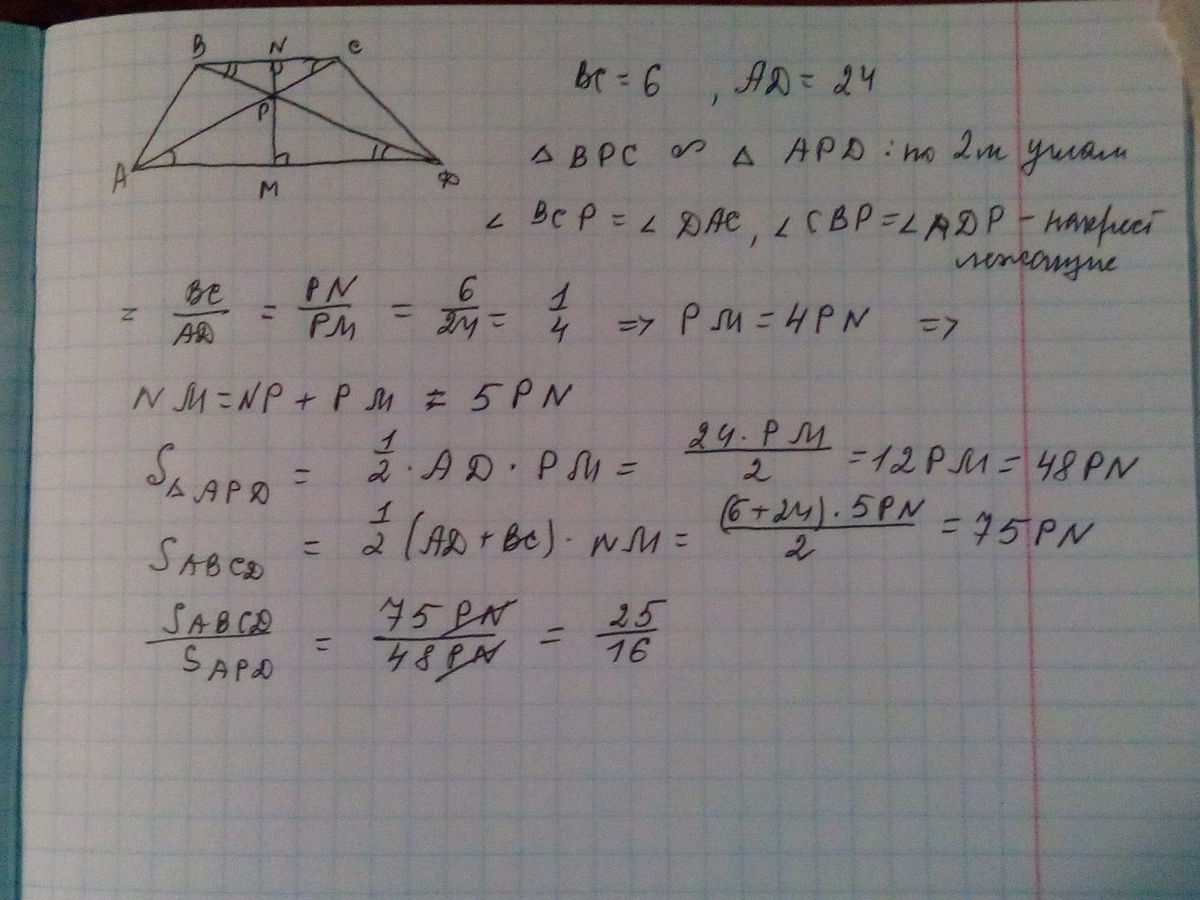 В трапеции ABCD основания AD и BC равны соответственно 24 и 6. Точка P- точка пересечения диагоналей. Найти отношение площади трапеции ABCD к площади треугольника APD