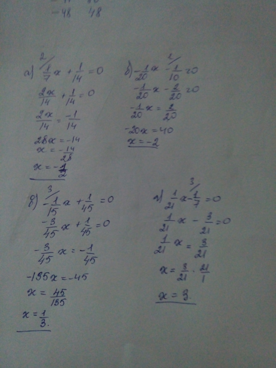 в) -1/15 *х + 1/45 = 0 -1/15 * х = -1/45 , умножим левую и правую часть уравнения на - 45 , получим : 3х = 1 х = 1/3