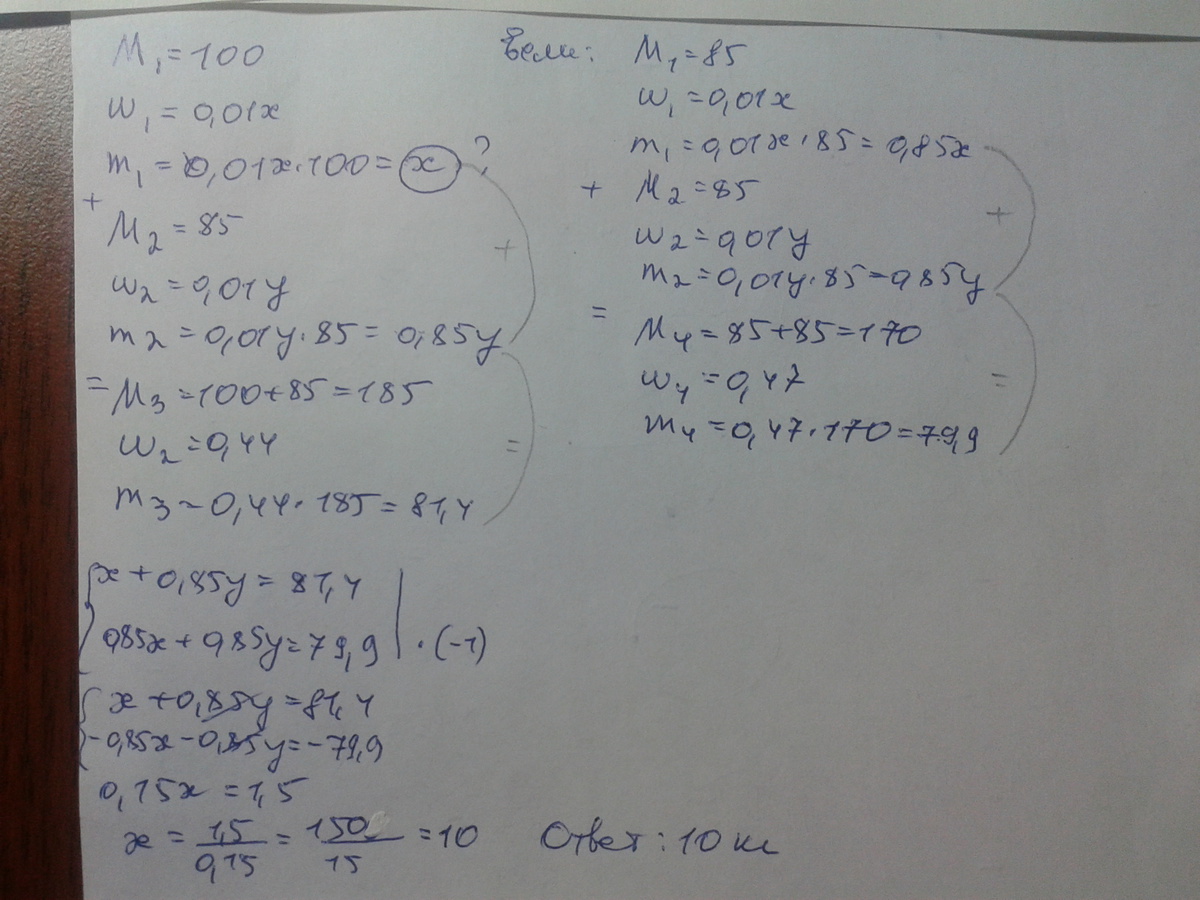 Имеется два сосуда. Первый содержит 100 кг, а второй — 85 кг раствора кислоты различной концентрации. Если эти растворы смешать, то получится