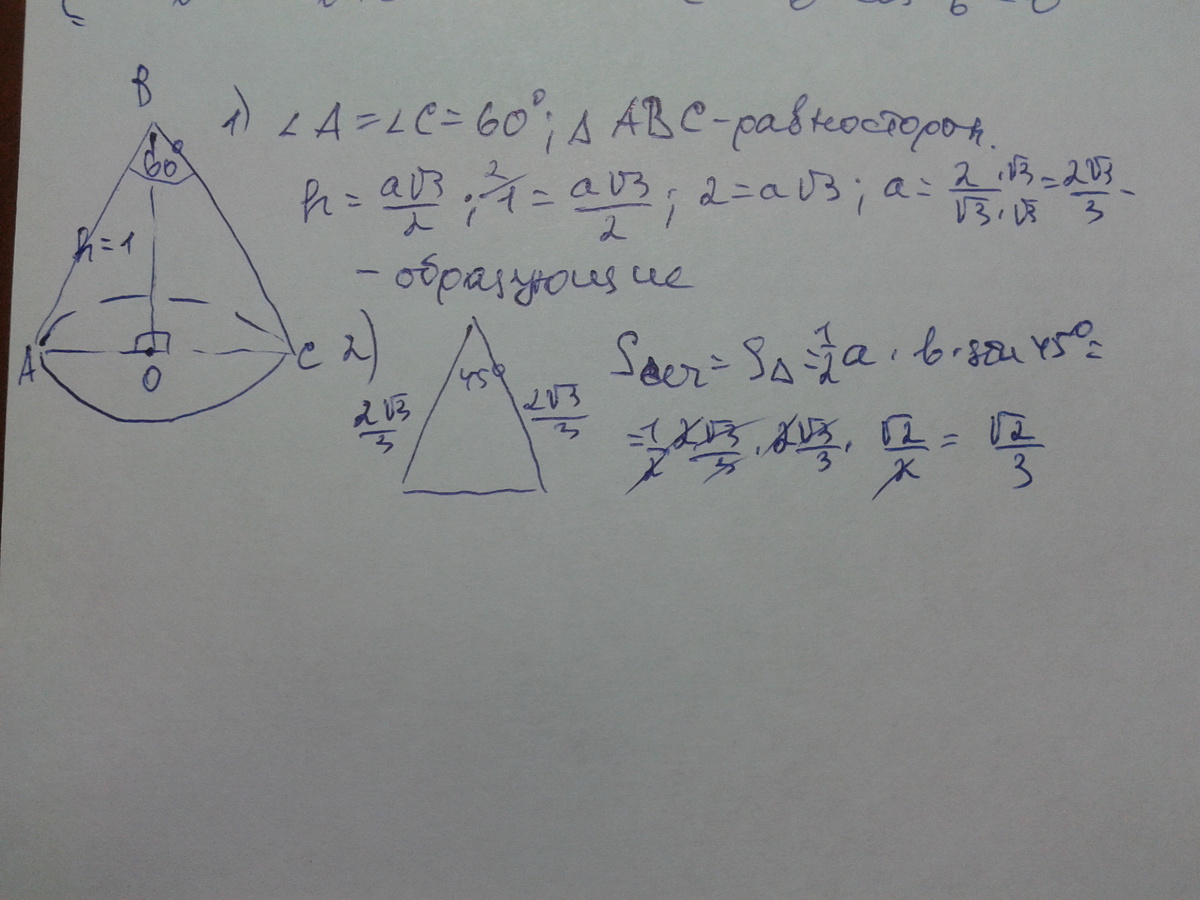 Угол при вершине осевого сечения конуса с высотой 1м равен 60 градусов .чему равна площадь сечения конуса проведенного через 2 образующие угол между которыми равен 45 градусов