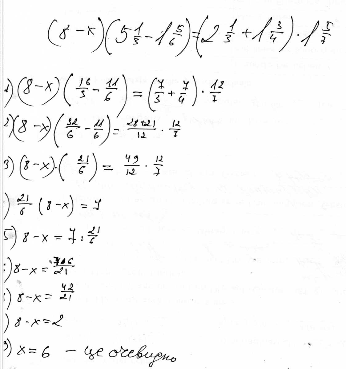 (8-х)(5 цілих одна третя - 1 ціла пять шостих) = (2 цілих одна третя + 1 ціла три чотвертих) помножити на одну цілу пять сьомих