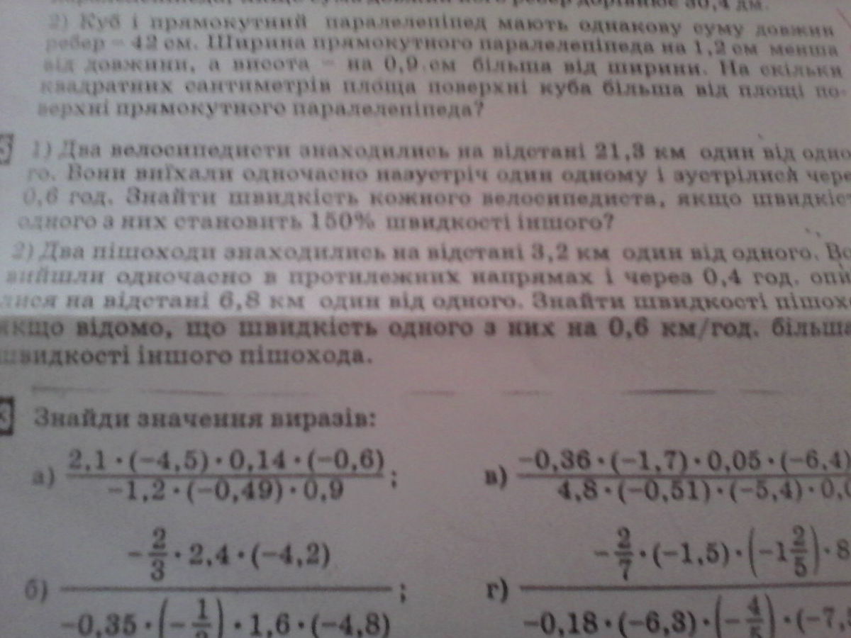 Два пешехода находились на расстоянии 3,2 км друг от друга. Они вышли одновременно в противоположных направлениях и через 0,4 ч окзались на расстоянии 6,8 км друг от друга. Найди скорости пешеходов если известно, что скорость одного из пешеходов на 0,6 км/ч больше скорости другого пешехода.