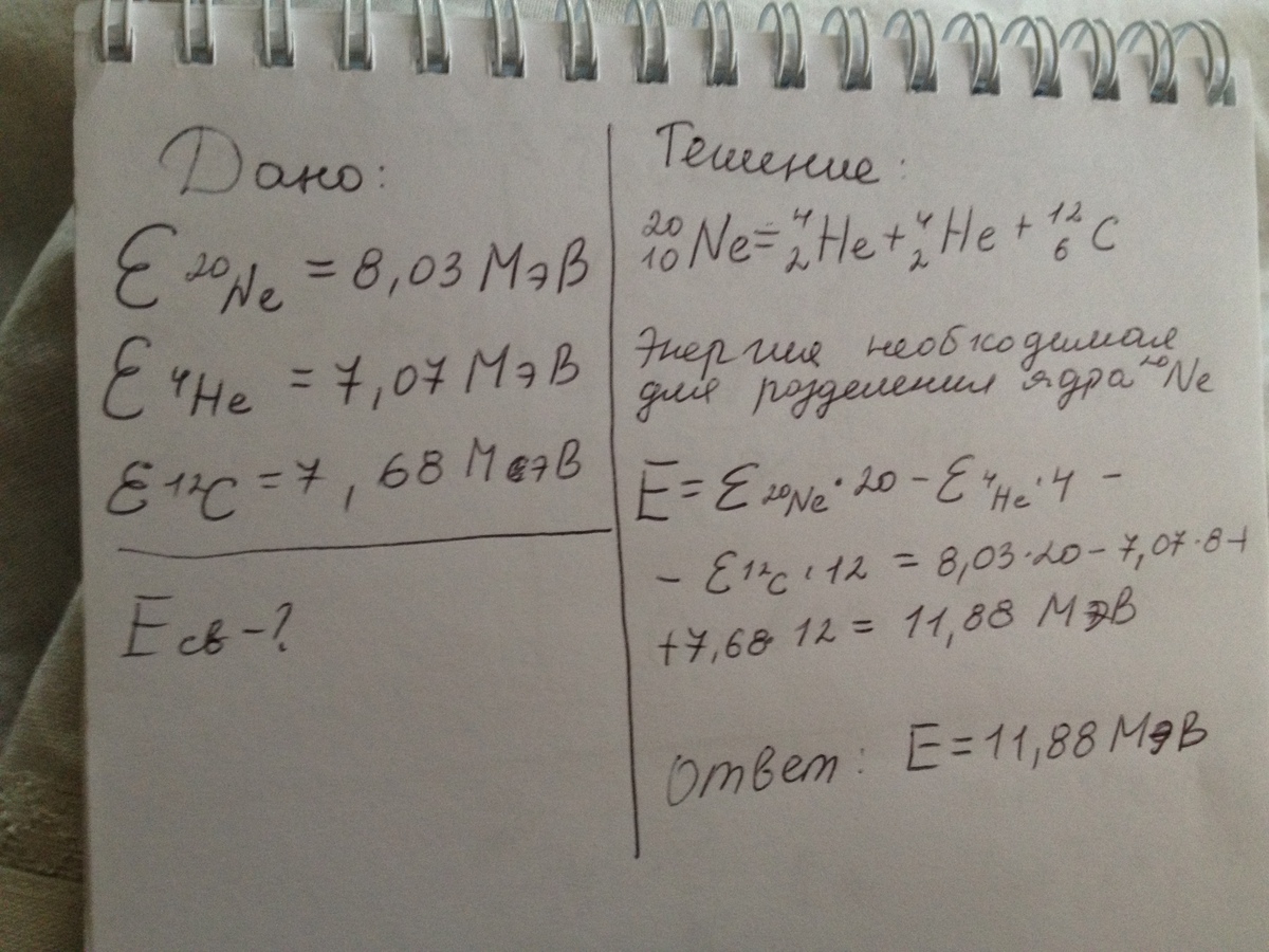 Нужно вычислить энергию, необходимую для разделения ядра Ne20 на две α-частицы и ядро С12, если известно, что энергии связи на один нуклон в ядрах Ne20, Не4 и С12 равны соответственно 8,03, 7,07 и 7,68 МэВ.
