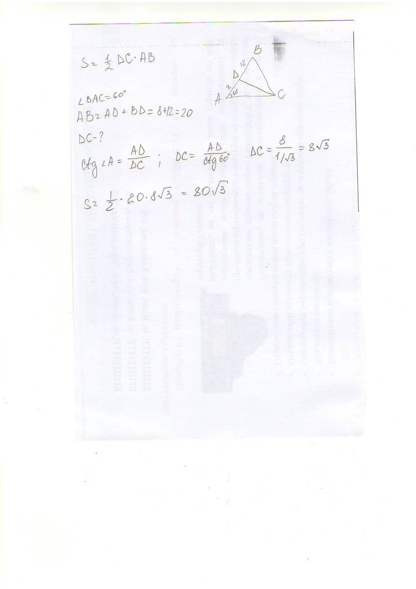высота СD треугольника ABC делит сторону AB на отрезки AD и BD так,что AD=8, BD12. Найти площадь треугольника ABC,если угол А равен 60 градусов
