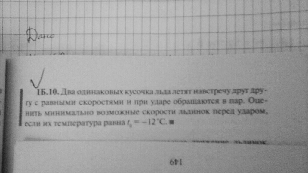 чтобы превратится в пар льдинке надо передать энергию достаточную для нагрева от -12 градусов Цельсия до 0, плавления, нагрева от 0 до 100 градусов воды и парообразования. Е=Q=Q1+Q2+Q3+Q4=c1m(0-(-12)) +лm+cm(100-0)+Lm=(2100*12+330000 +4200*100+2,3*10^6) m=3075200m. Льдинка до удара должна обладать кинетической энергией Ек =mv^2 /2=Q=3075200 m, скорость льдинка v= корень из (3075200*2)=2480 м/с,но льдинка было две и двигались они на встречу друг другу, обе льдинки обладали одинаковой кинетической энергией и одинаковой массой., следовательно имели равные скорости.