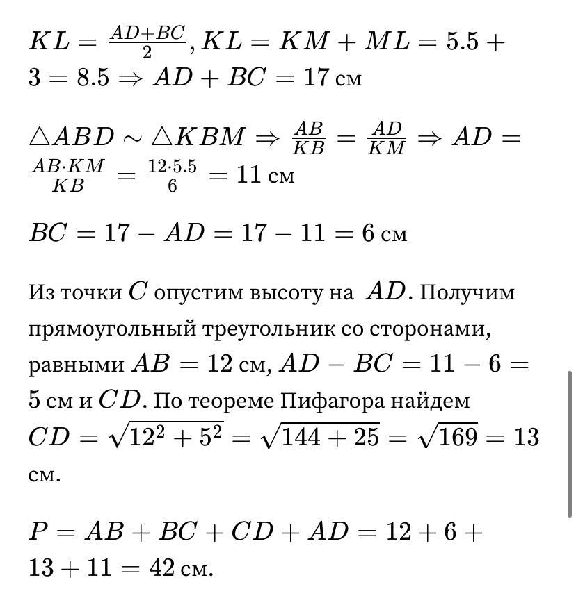 У трапеції АВСD (АD||ВС), ,АВ = 12 см. Діагональ ВD ділить середню лінію КL трапеції на відрізки КМ і МL такі що КМ = 5,5 см і МL= 3 см. Знайти периметр трапеції.