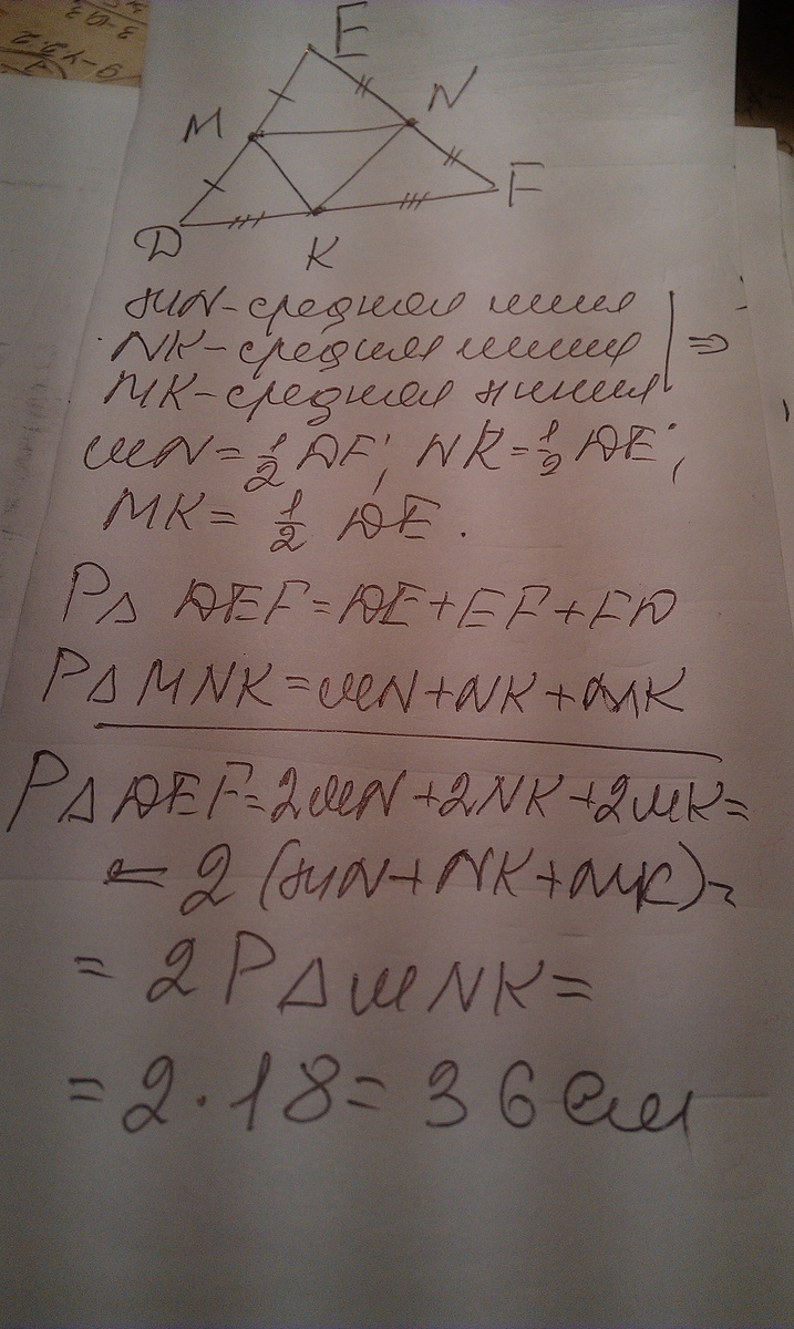 В треугольнике DEF точки M, N и К - середины сторон DE, EF и DF соответственно. Найти периметр треугольника DEF, если периметр треугольника MNK равен 18 см.
