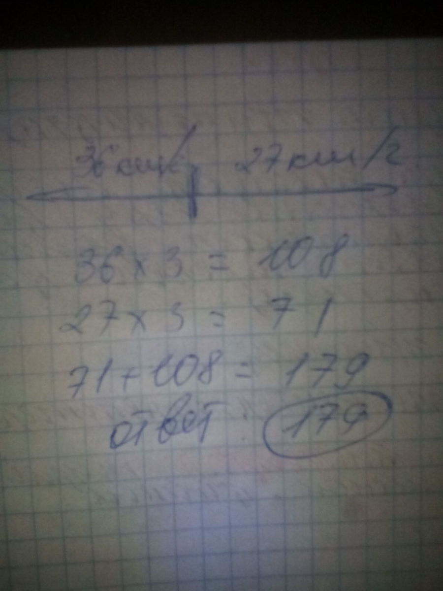 От одной пристани в противоположных направлениях одновременно отошли два теплохода. Скорость одного теплохода равна 27 км/ч, а второго 36км/ч. Каким будет расстояние между ними через 3 ч после начала движения?