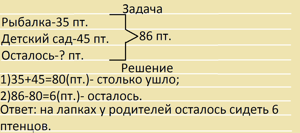 математика 2 класс .составить условию задачи и решить. В стае 86 птенцов,35 птенцов ушли с родителями на рыбалку,45 в детский сад.ск.птенцов осталось сидеть на лапках родителей.
