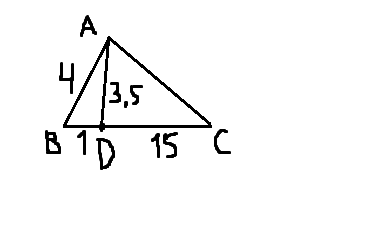 3)Дан треугольник АВС. Найти: сторану АС , если АВ=4 см, а точка D преналлежит стороне ВС, причём ВD=1см ,DС=15 см, АD =3,5 см