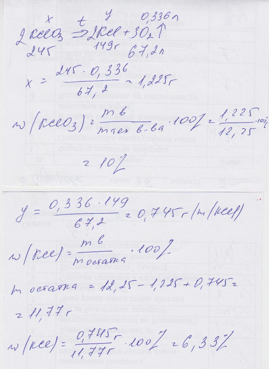 Хлорат калия массой 12,25г разложили при нагревании в присутствии катализатора и получили 336мл кислорода (н.у.). Найдите массовую долю хлорида калия в сухом остатке и степень разложения бертоллетовой соли.