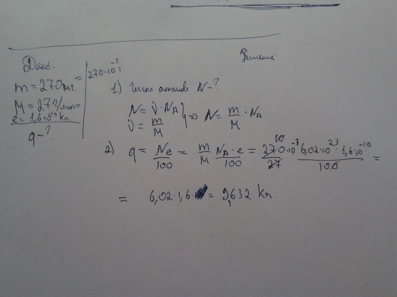 В алюминиевом шарике массой 270 мг каждый из 100 атомов лишился одного электрона проводимости. Выразить электрический заряд шарика