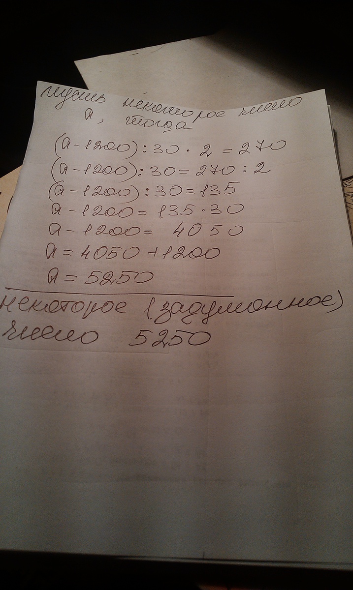 Если из некоторого числа вычесть 1 200,затем полученную разность уменьшить в 30 раз и полученное частное увеличить в 2 раза,то произведение будет равно 270. Чему равно это число?