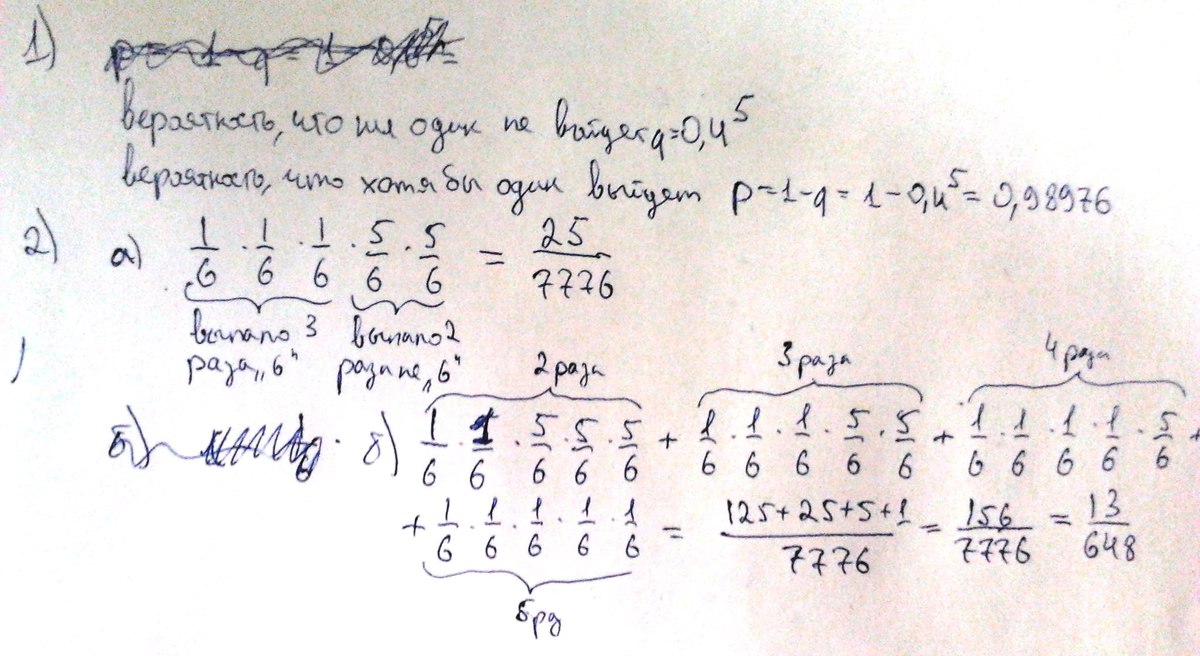 2)какова вероятность того, что при пятикратном выбрасывании кубика "6" выпадает: