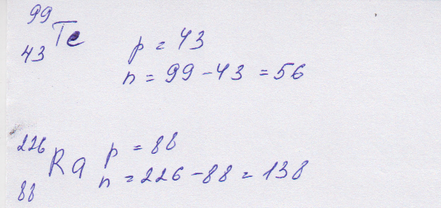 рассчитайте число протонов и нейтронов в ядре атома технеция (изотоп с атомной массой 99)и ядре атома радия(изотоп с атомной массой 226)