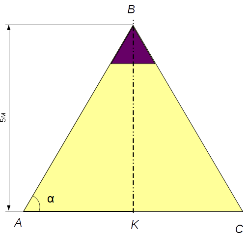 Получим правильный треугольник АВС, при этом нам известна его высота BK=5м. Радиус, который требуется найти, это на нашем чертеже половина основания AC (AK=AC/2) (BK это по совместительству еще медиана и биссектриса)