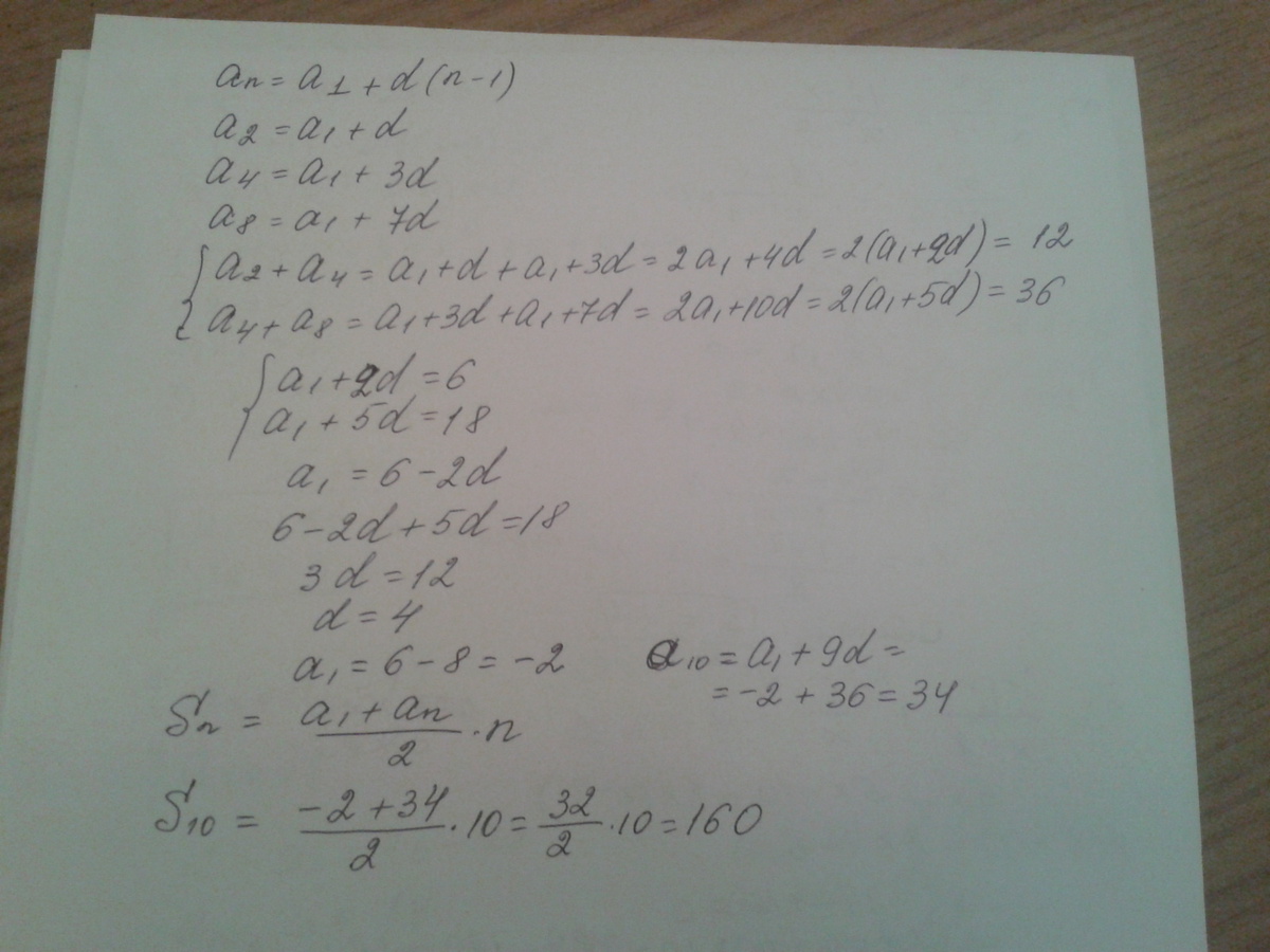 Найдите сумму первых десяти членов арифметической прогрессии, в которой a2+a4=12, a4+a8=36