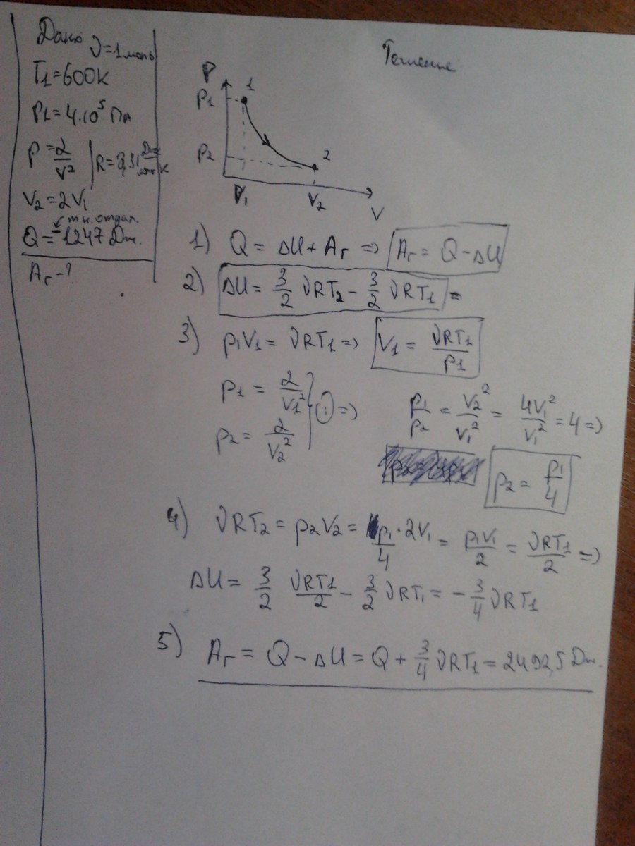 Один моль аргона, находящийся в цилиндре при температуре Т1=600К и давлении Р1=4*10^5 Па, расширяется и одновременно охлаждается так, что его давление при расширении обратно пропорционально квадрату оъема. Конечный объем газа вдвое больше начального. Какую работу совершил газ при расширении, если он отдал холодильнику Q=1247Дж теплоты?