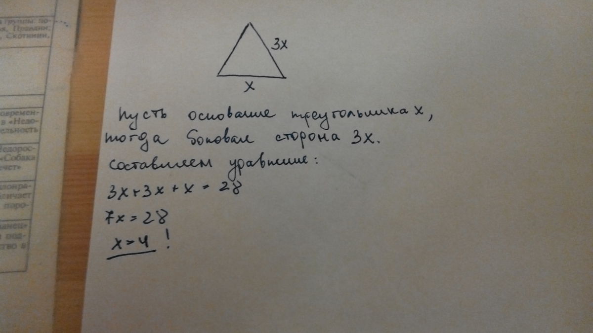 Основание равнобедренного треугольника в 3 раза меньше боковой стороны, а периметр его равен 28 см . Определите стороны треугольника