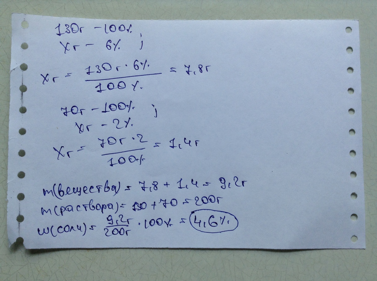 смешали два раствора: один массой 130 грамм и с массовой долей соли 6%, второй массой 70 грамм и с массовой долей этой же соли 2%. Массовая доля соли, содержащейся в образовавшемся растворе, равна: