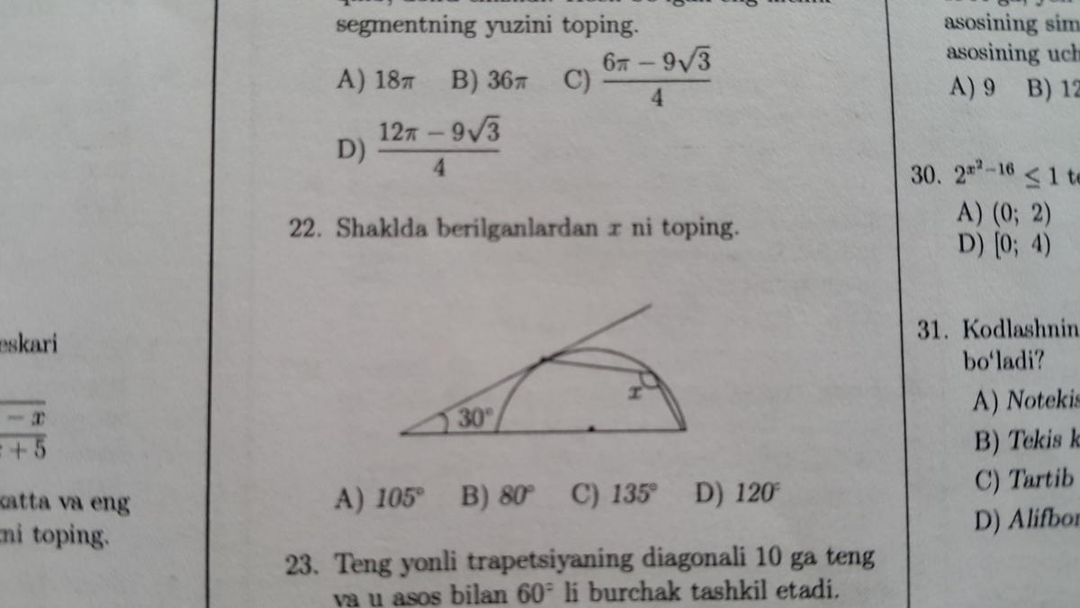 Искомый угол - вписанный. Он опирается на дугу 60 градусов + полуокружность. Т.е. он опирается на дугу 60 + 180 = 240 ⇒ х = 120