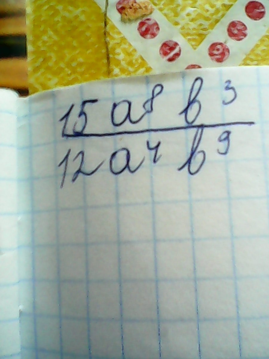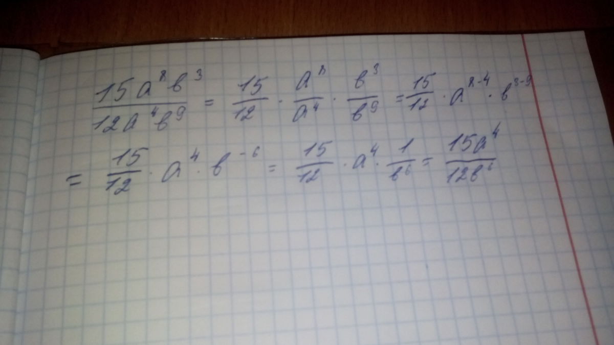 15a⁸b³/12a⁴b⁹=15a⁴/12b⁶=5a⁴/4b⁶